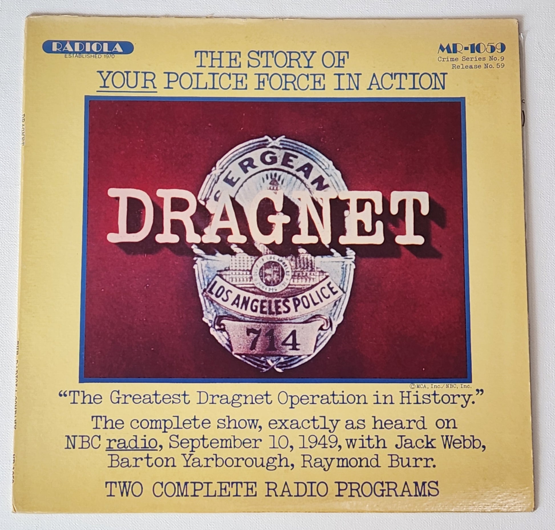 The Dragnet series helped define 1950s Los Angeles on screen — its theme and sound became icons of American television and film. This piece honors that legacy, designed to highlight the L.A. skyline while preserving the original record label for a distinctive, authentic finish.