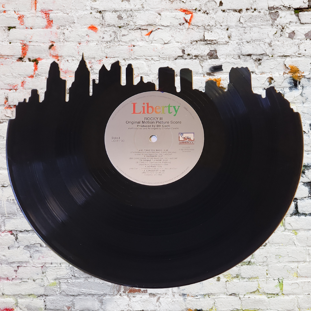 Philadelphia skyline vinyl record wall art handcrafted from an original Rocky III Soundtrack album and thoughtfully packaged in the album sleeve. Add this unique piece of wall art to your collection.