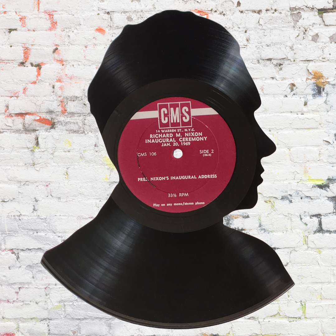 Limited Edition wall art handcrafted from a repurposed an original vinyl record recording of Richard Nixon's 1969 Inauguration Speech. A historical piece of wall décor and a unique holiday gift for music lovers.